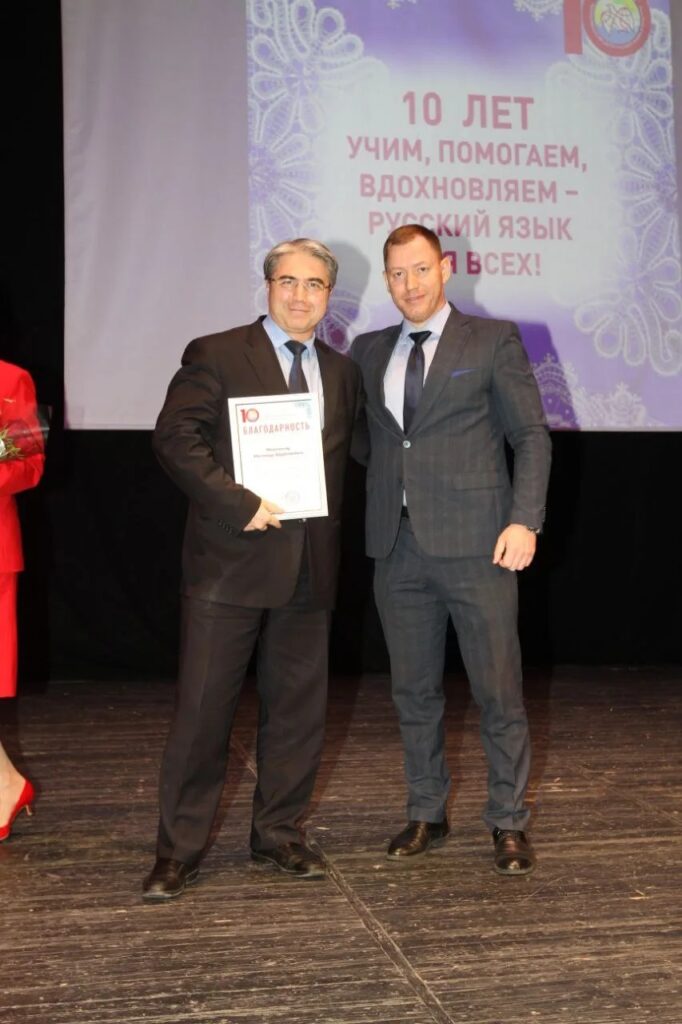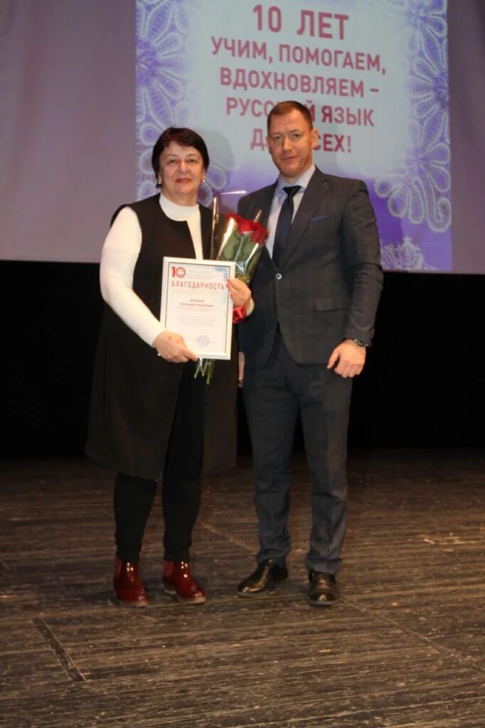 Праздничное мероприятие включало в себя не только подведение итогов за десятилетие, но и награждение всех тех, кто в эти годы активно участвовал и всячески поддерживал Центр в его начинаниях. Так, благодарственными письмами были отмечены люди разных профессий и вероисповеданий: архиепископ Махачкалинский и Дербентский владыка Варлаам, настоятель Храма Казанской иконы Божией матери иеромонах Иоанн, заместитель председателя Комитета Народного Собрания по национальной политике, вопросам общественных и религиозных объединений и межпарламентским связям Елена Ельникова, начальник отдела Правительства РД межнациональных отношений, взаимодействия с общественными организациями и СМИ Наталья Евсеева, заместитель министра культуры РД Марита Мугадова, член общественной Палаты РД Борис Ханукаев, советник Главы города Буйнакск Александр Фролов, зам. директора по воспитательной работе Махачкалинского автомобильно-дорожного колледжа Марьям Мухтарова, шеф-редактор РГВК «Дагестан» Магомед Махатилов, методист управления образования г. Махачкала Клавдия Гороховская, профессорско-преподавательский состав ДГПУ им. Р. Гамзатова, ДГУ, ДГТУ – Асият Кукуева, Гюльнара Чамсединова, Гумай Алиомарова, Жанна Малецкая и Артем Плохарский, Нина Гарунова, Аида Бабаева, Гюльнара Алиева – и это еще далеко не полный список людей, неравнодушных к работе, направленной на патриотическое воспитание молодежи и популяризацию русского языка в Дагестане. Особой изюминкой мероприятия стали выступления артистов. На сцене с музыкальным репертуаром выступили солист театра оперы и балета Сергей Поздняков, заслуженный артист РД Денис Федоренко, начинающая артистка, студентка колледжа культуры и искусств им. Б. Мурадовой Амина Магомедова и, конечно, замечательный коллектив ансамбля русской песни “Берегиня” Республиканского центра русского языка и культуры.